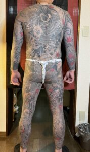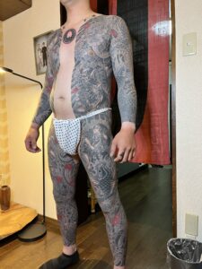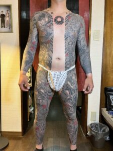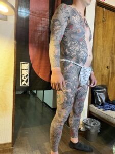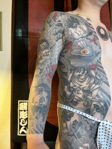 今回は背中に悪源太。脇腹〜太ももにかけて平清盛と配下、膝から下は遊び心でお客様ご希望の図案を配置。腕はカバーアップの為に龍を入れた。